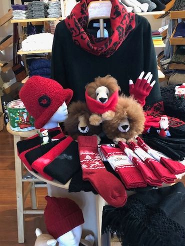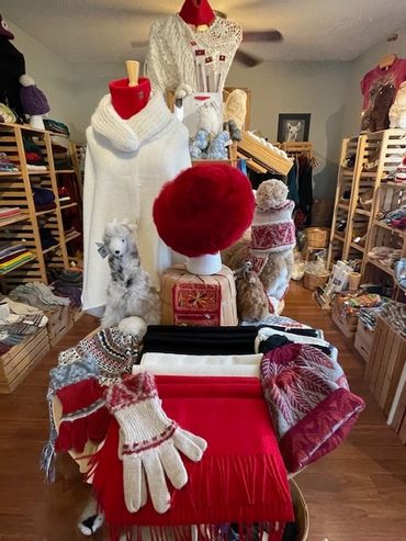 Scarves, sweaters, shawls, ponchos • Hats, gloves, socks • Throws, blankets, pillow covers • 100% alpaca yarn and rovings from our animals in various weights in natural and dyed colors • Knitting and crochet needles, and patterns • Stuffed animals, toys • Gifts